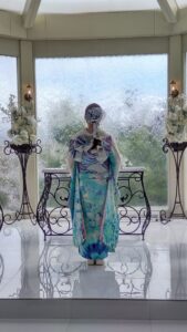 スワロフスキーが散りばめられた万華鏡がモチーフの珍しい振袖✨。モダンな薔薇の帯や存在感ある帯締め、ラインストーンがきらびやかな重ね襟はこの振袖のために作られたものです。