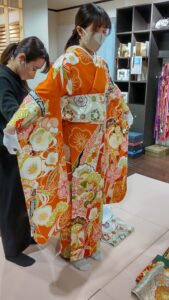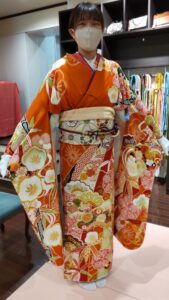 オレンジの振袖をおススメしたところ、「ここに来る前にオレンジの着物がいいねって話してたんだよね」とお母様(^-^)。